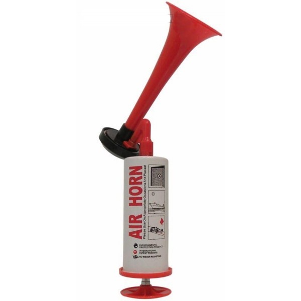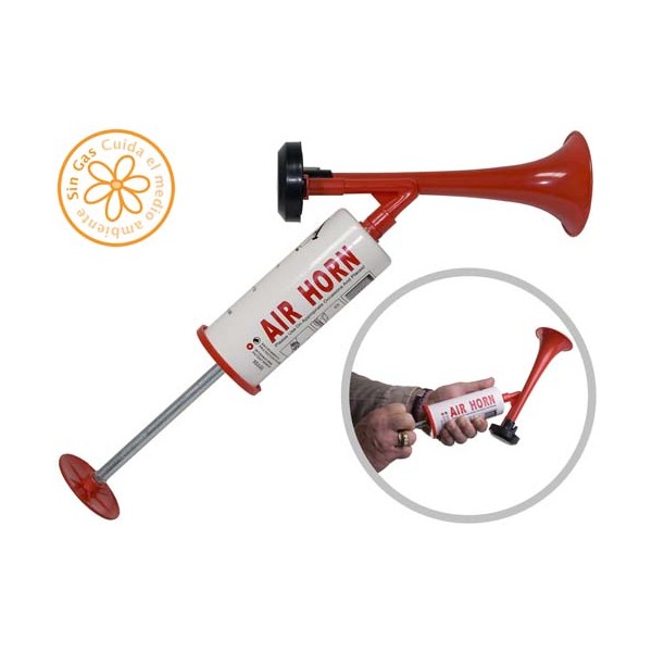 Bocina desmontable de aire comprimido ecológica. Se puede utilizar en todo tipo de actos publicos, ya que no contiene gas. Nunca se agota, el aire se comprime como un bombin pequeño, no requiere más que un poco de fuerza para hacerla sonar. Para embarcaciones, eventos deportivos, fiestas, etc