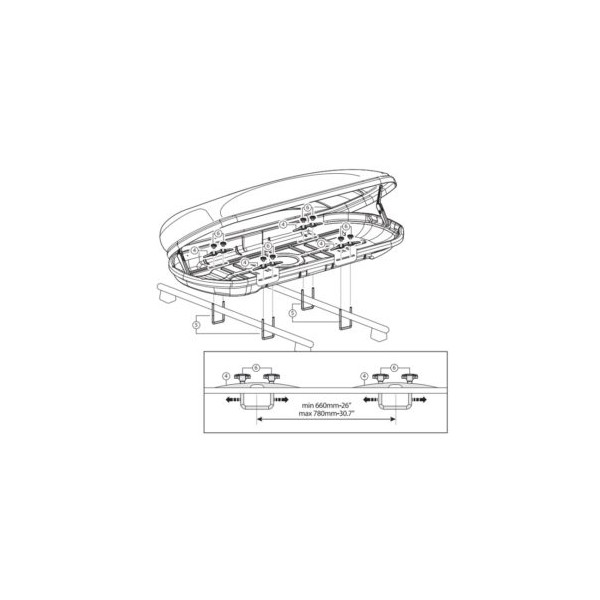 - Cofre portaequipajes.- Fijación con abarcón en U para barras de techo de hasta 60 mm de ancho y fijación en T para barras con carril central.- Capacidad: 400 litros.