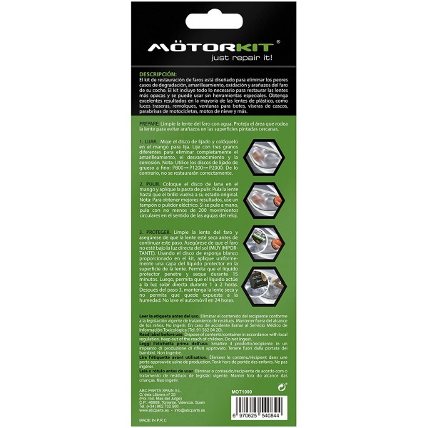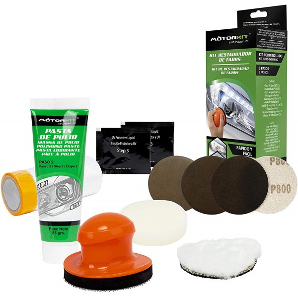 El kit de restauración de faros está diseñado para eliminar los peorescasos de degradación, amarilleamiento, oxidación y arañazos del faro de su coche.El kit incluye todo lo necesario para restaurar las lentes más opacas y se puede usar sin herramientas especiales.