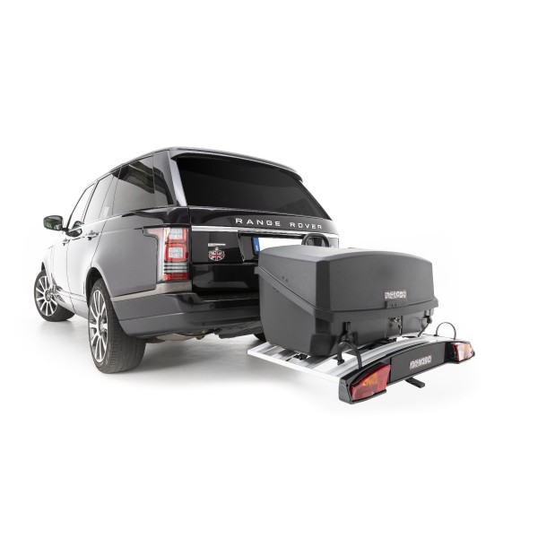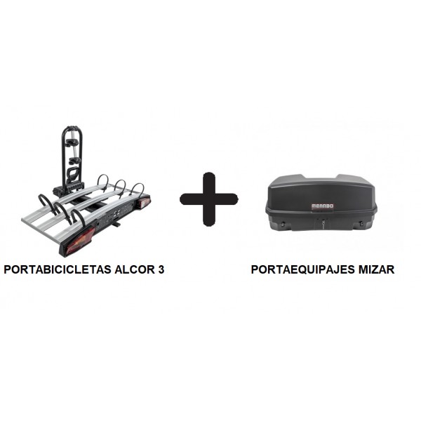 Características generales portabicicletas: Válido para 3 bicicletas.Válido para 2 Ebikes / Fatbikes máximo.Acople rápido a bola de remolque de su vehículo..Fabricado en acero y carriles de aluminio.Llave antirrobo a la bola.Abatible.45º.Homologación TÜV GS Características generales portaequipajes:Cofre portaequipajes MIZARCapacidad: 300 litros.Color: Negro.Medidas: L x W x H = 2090x790x366mm Cierre antirrobo. Sistema de fijación mediante abrazaderas al portabicicletas, pomo antirrobo con sistema de cierre de seguridad (solo se permite retirar la llave si está completamente cerrado).