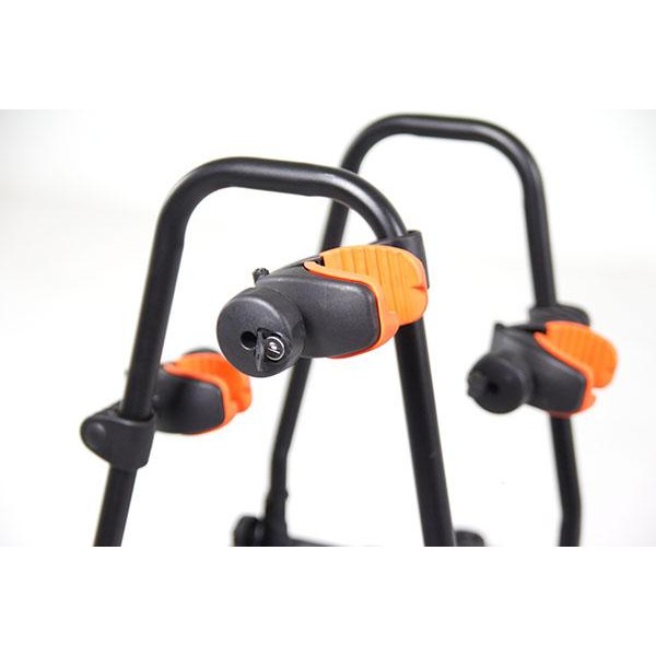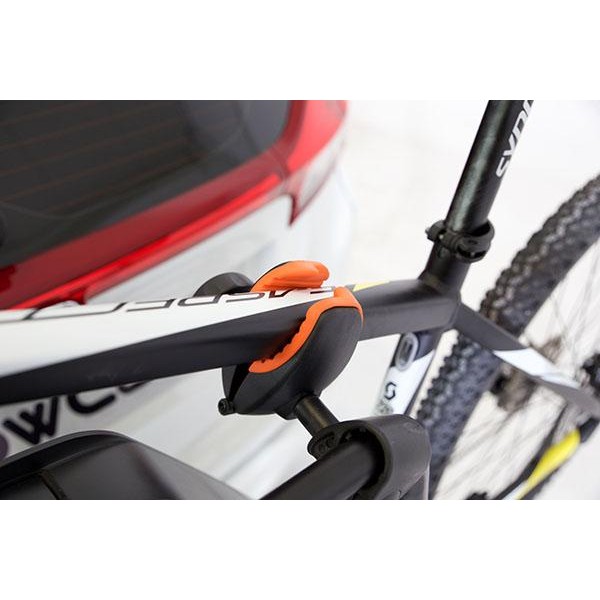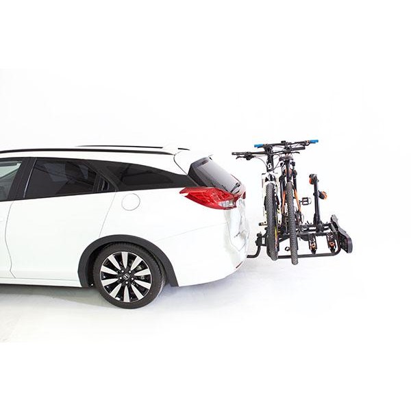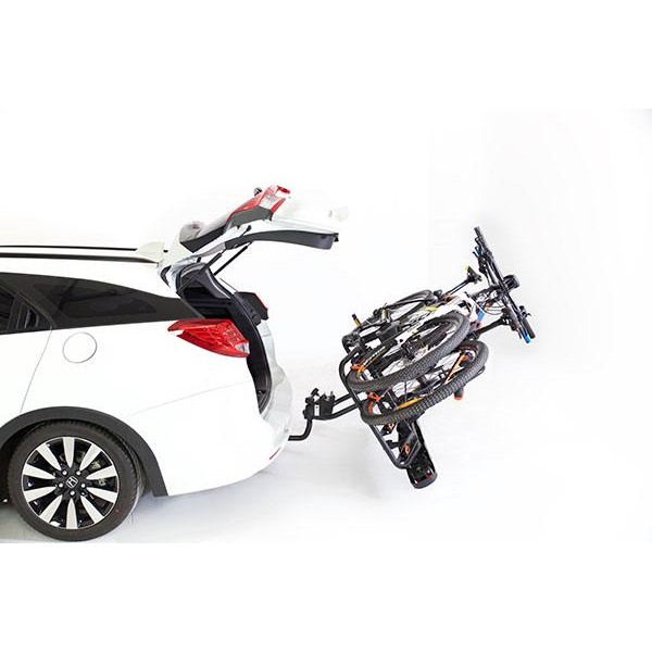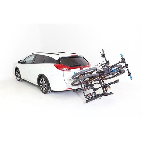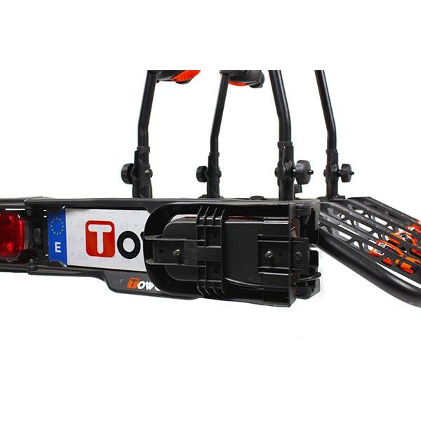 Portabicicletas para cuatro bicicletas abatible. El portabicicletas sobre bola de enganche Towcar T-4 es abatible para poder acceder al maletero con las bicicletas cargadas. Las bicicletas se fijan al portabicis mediante pinzas que no dañan ni rayan el cuadro de la bicicleta, dispone de cerraduras antirrobo para las bicicletas y para la bola de enganche.