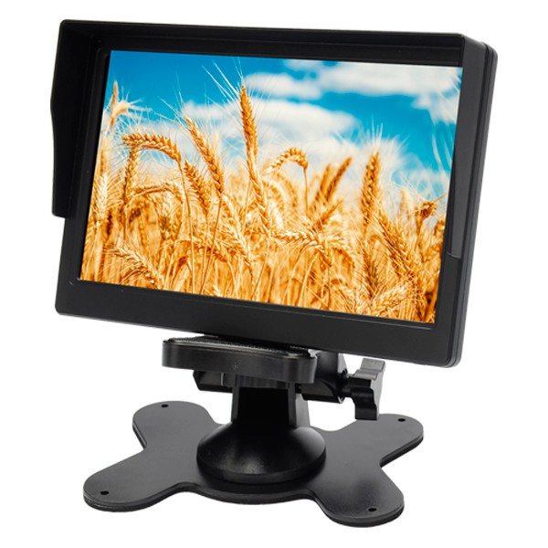 Monitor de 7″ con dos entradas de vídeo RCA.Tiene un cable excitador para el cambio de señal de vídeo.Con memoria de alimentación (si al apagar el vehículo queda apagado, al encender el vehículo permanecerá apagado y viceversa).El monitor se suministra con soporte de pie.Color negro.Formato 16:9.Voltaje de trabajo 12/24 voltios.